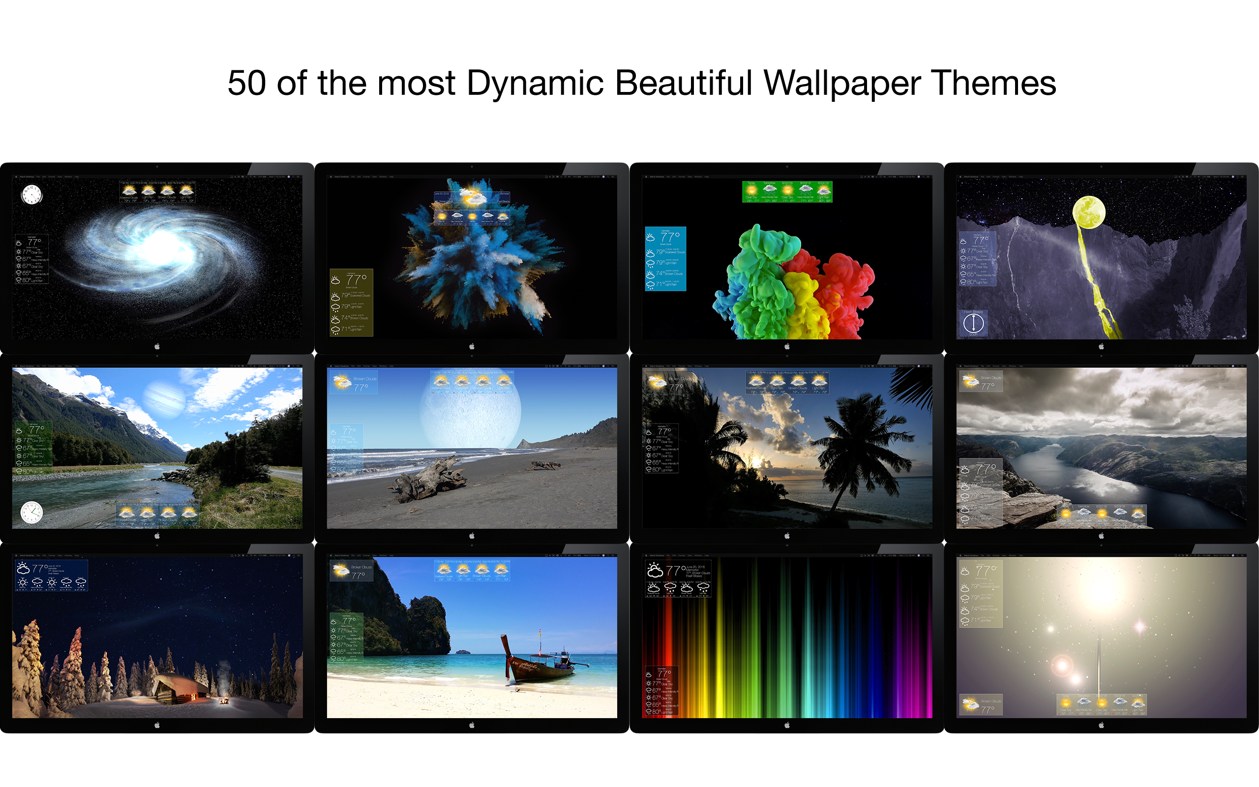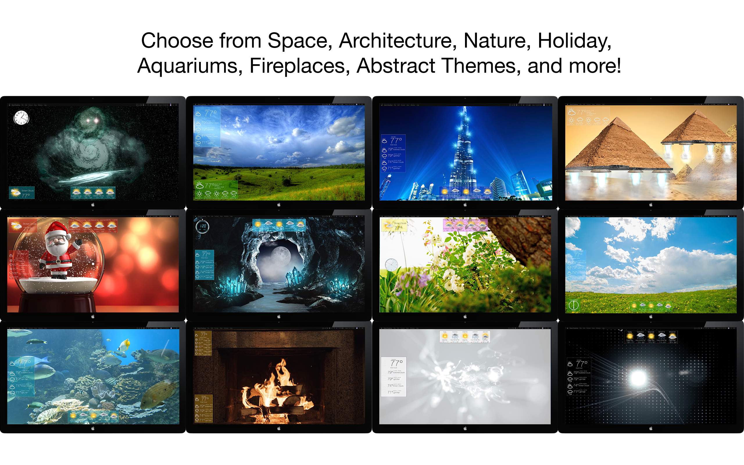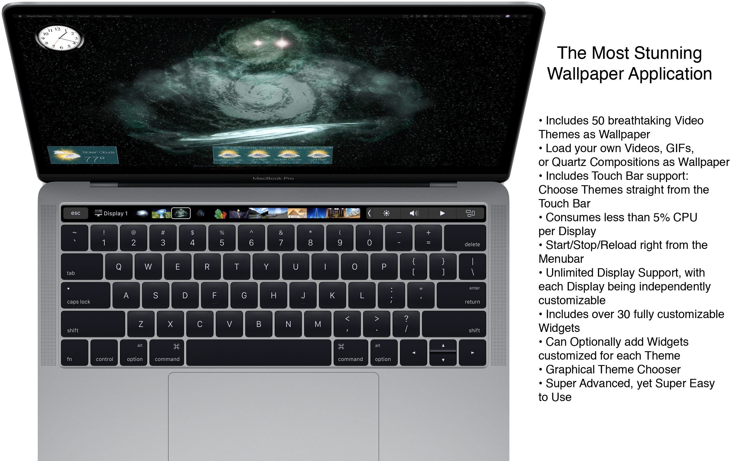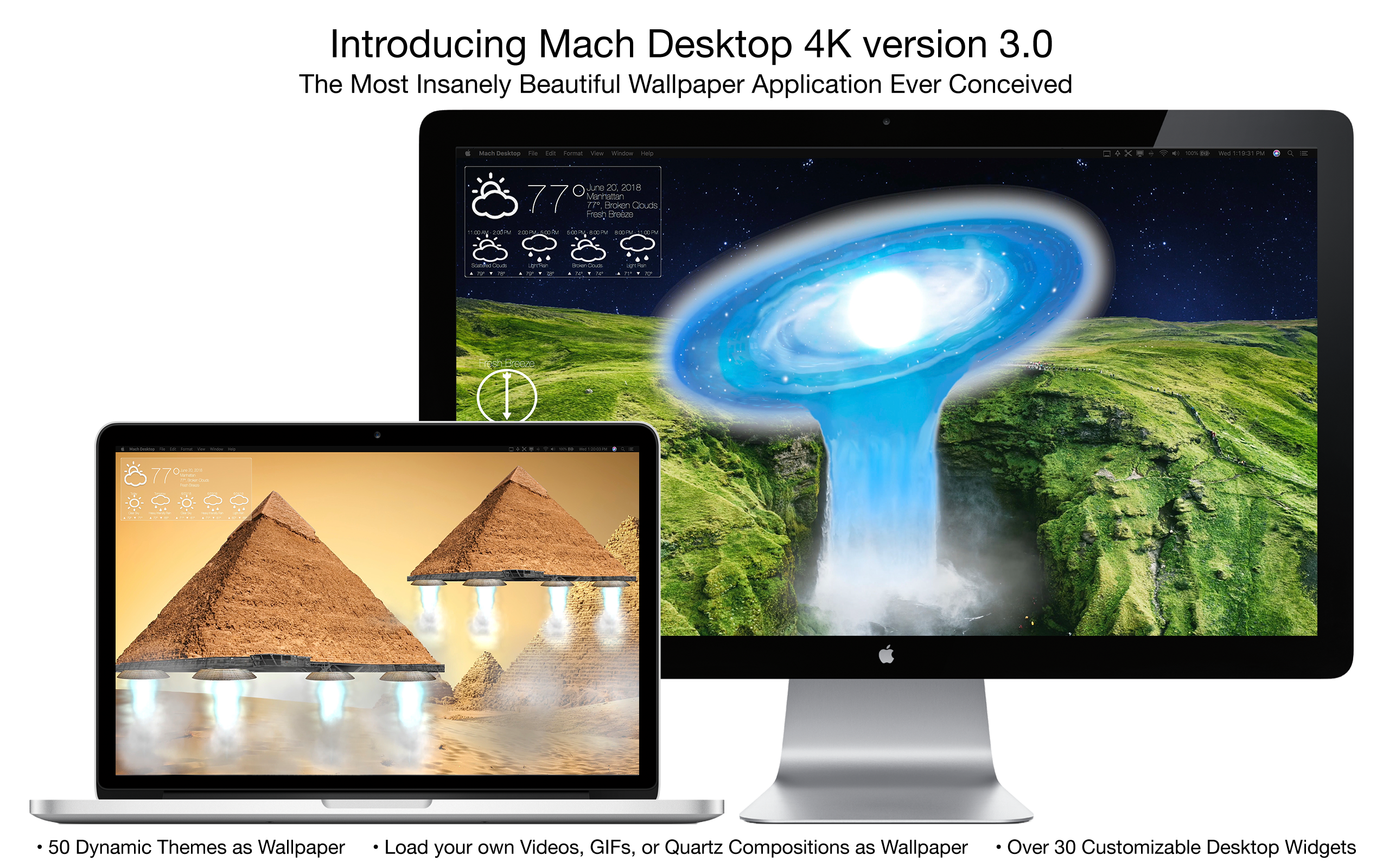 Introducing Mach Desktop 4K version 3.0: The most advanced and beautiful wallpaper application ever conceived for a personal computer! Mach Desktop 4K features 50 stunning dynamic Themes; allows you to load your own Videos, GIFs, or Quartz Compositions as Wallpaper, and allows you to add over 30 different Widgets to your Desktop. Choose from a huge variety of meticulously crafted dynamic Themes from categories including: Space, Fantasy, Architecture, Fields, Nature, Holiday, Aquariums, Fireplaces, Abstract Themes, and much more! Mach Desktop 4K also features GPU-acceleration support so Themes use little-to-no CPU — freeing up your computer for other tasks.