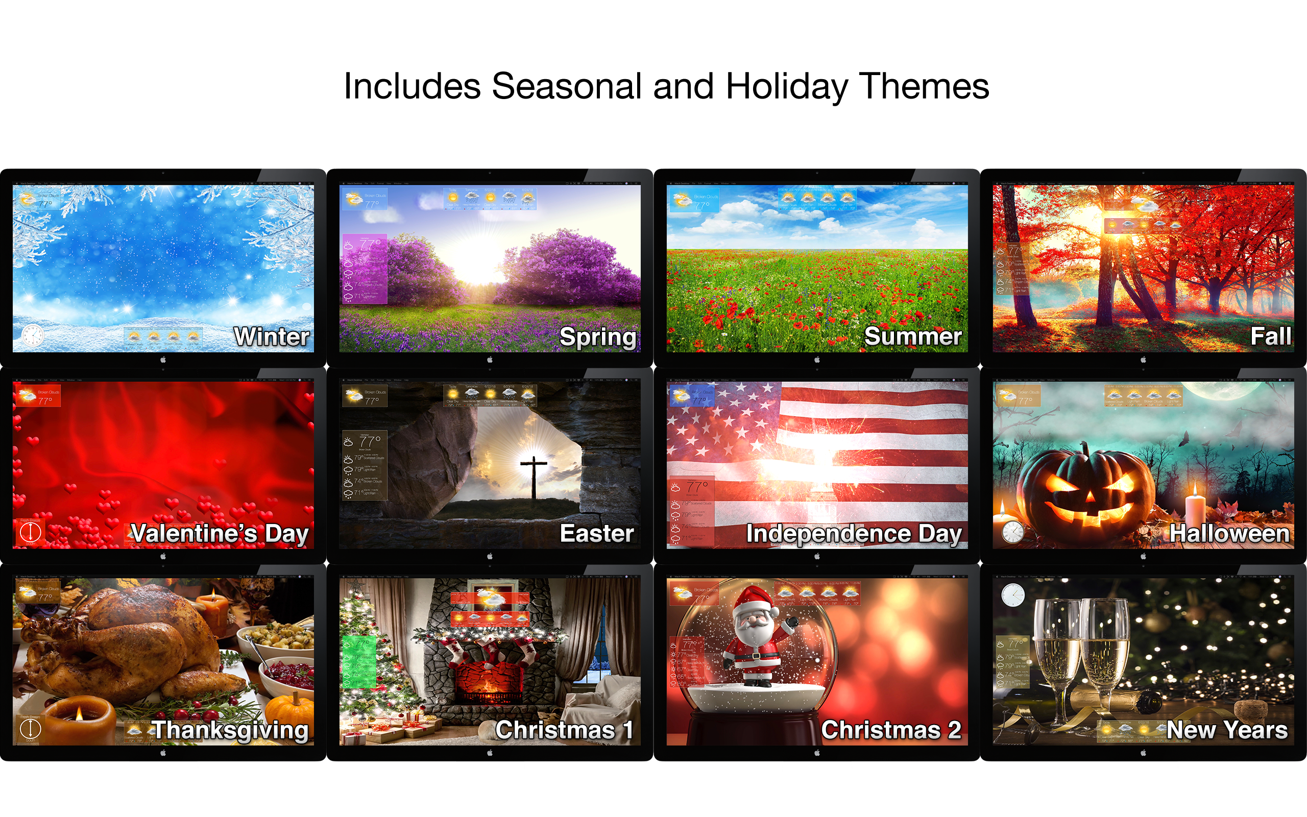 If that still wasn't enough, with the Widget Manager you can add Widgets to your Desktop with a single click! Select a Widget and set its size, font, foreground color, and background color — and easily position a Widget anywhere you want. Choose from over 30 different Widgets including Time, Date, Current Weather, 12 hour Weather forecast, 5 day Weather forecast, a variety of Clocks, and much much more. You can even add Web pages to your Desktop with the Web Page Widget, or add your own Custom Text Widgets (including Emojis) to your Desktop super easily. Don't feel like adding and customizing Widgets on your own? No problem! Mach Desktop 4K can automatically add Widgets positioned, colored, and tailored for each individual Theme. With all these features, Mach Desktop 4K has no equal and is the only application of its kind!