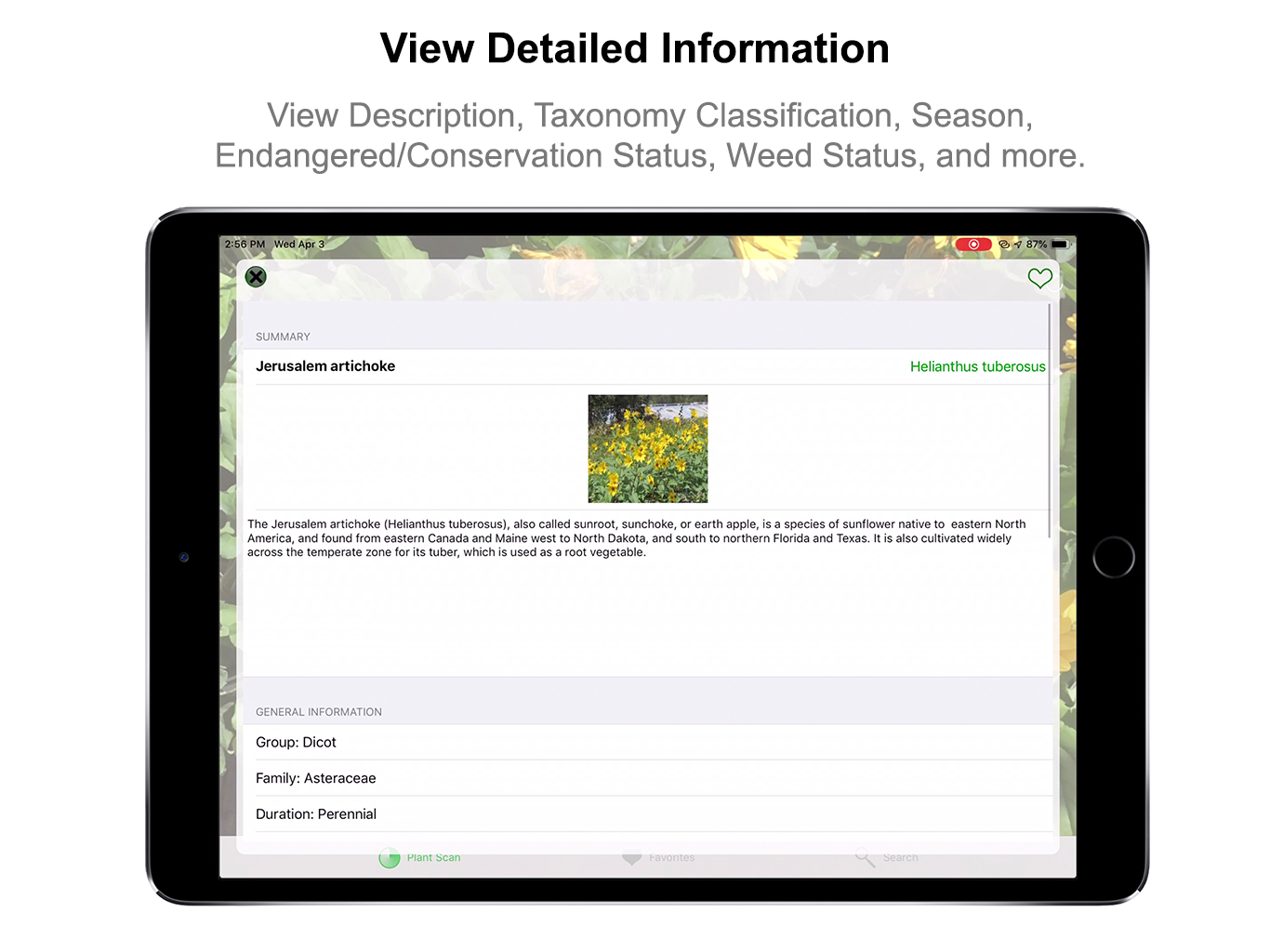 With Plant Scan Pro you can view far more detailed information than any other app; Including but not limited to: General Summary, Taxonomy Classification, Season, Endangered/Threatened Status, Weed Status, and much more. If you see a plant that you want to save, you can add the Plant to your Favorites simply by pressing the Heart button. And with the Search function, you can manually Browse or Search through our massive database of Plants. With all these features Plant Scan Pro provides a superior Plant Identification experience all while being super easy to use!