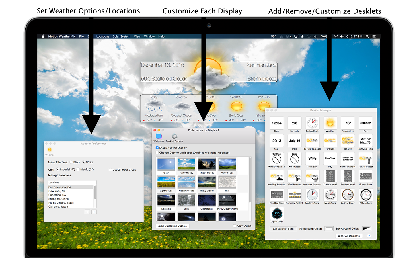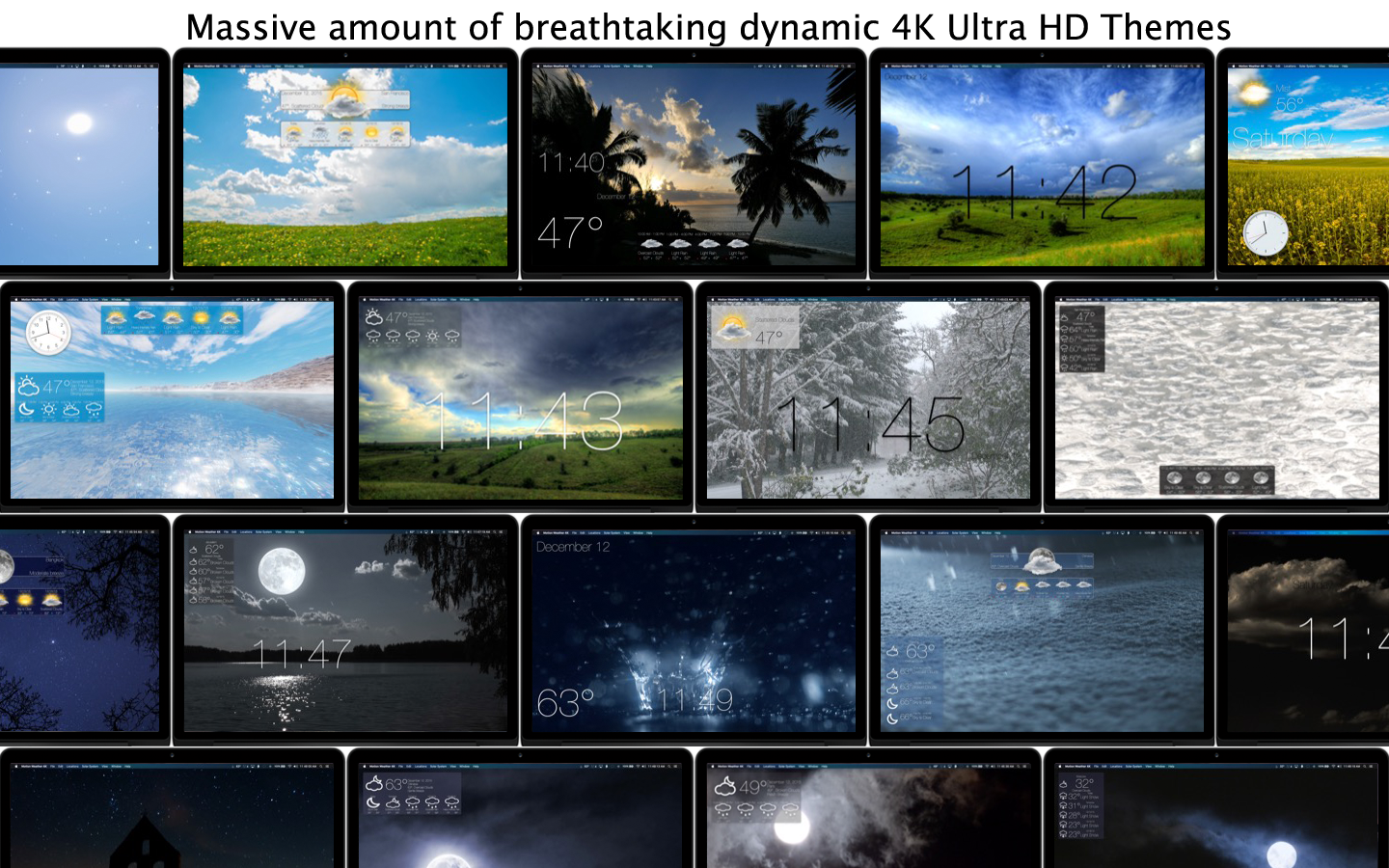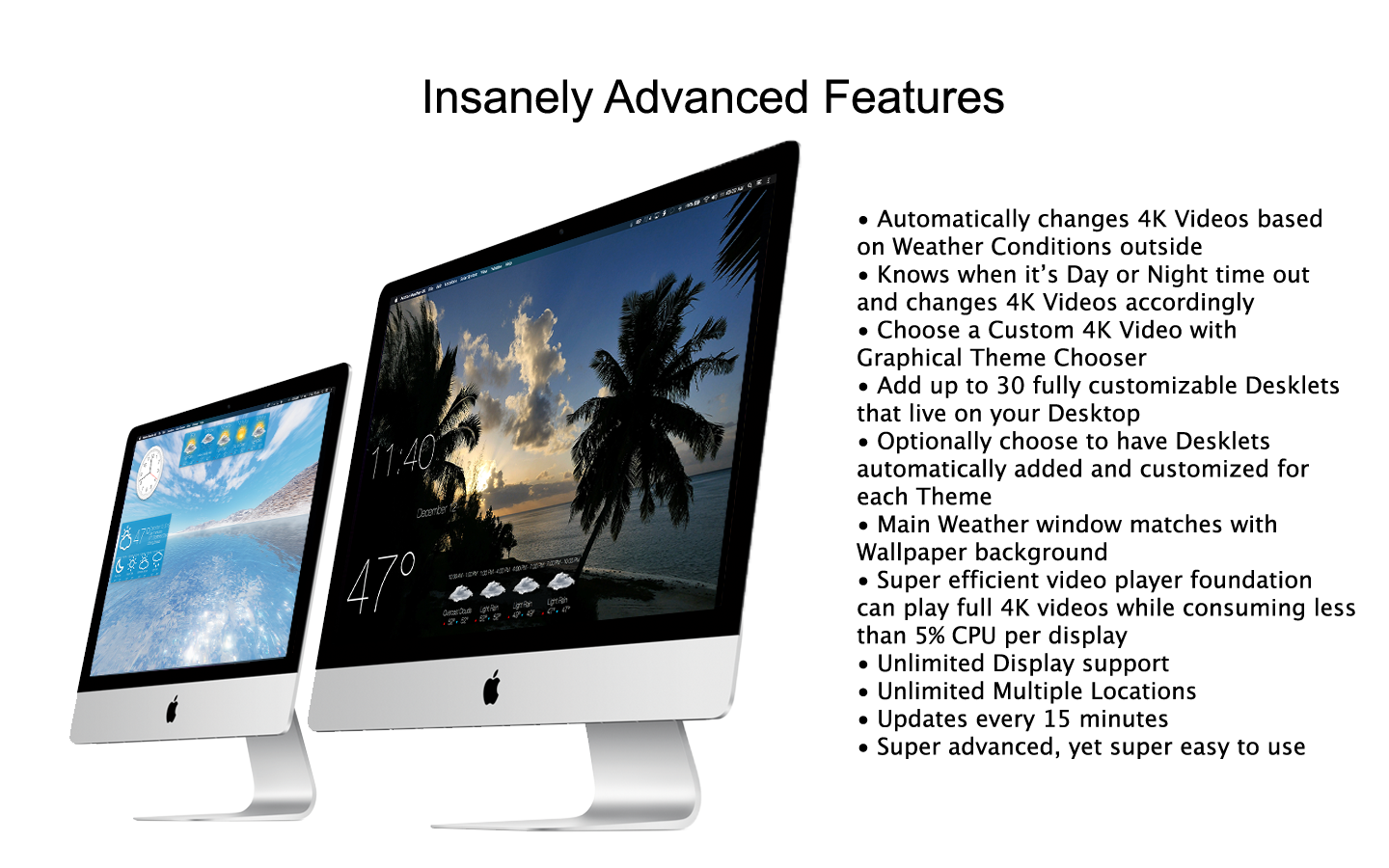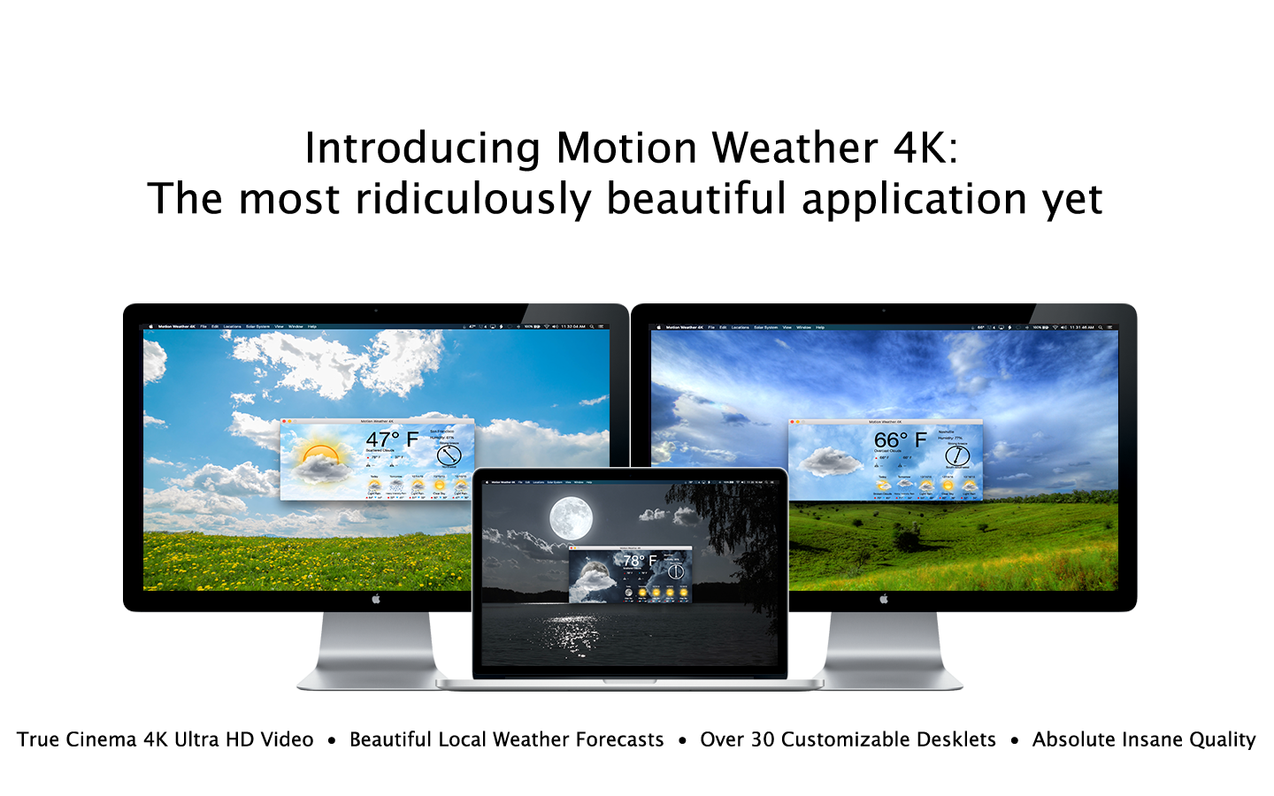 This application is so crazy, that is has *three* different Preferences Windows: Weather Preferences (Set Weather Options and Locations), Display Preferences (Customize Wallpaper for each display), and the Desklet Manager which lets you add over 30 Desklets to your Desktop that are completely customizable. In addition to adding Desklets to your Desktop individually, you can also set Motion Weather 4K so it automatically adds customized Desklets for each Theme - giving you relative information right on your Desktop when you need it and ensuring your Wallpaper and Desklets will always match.