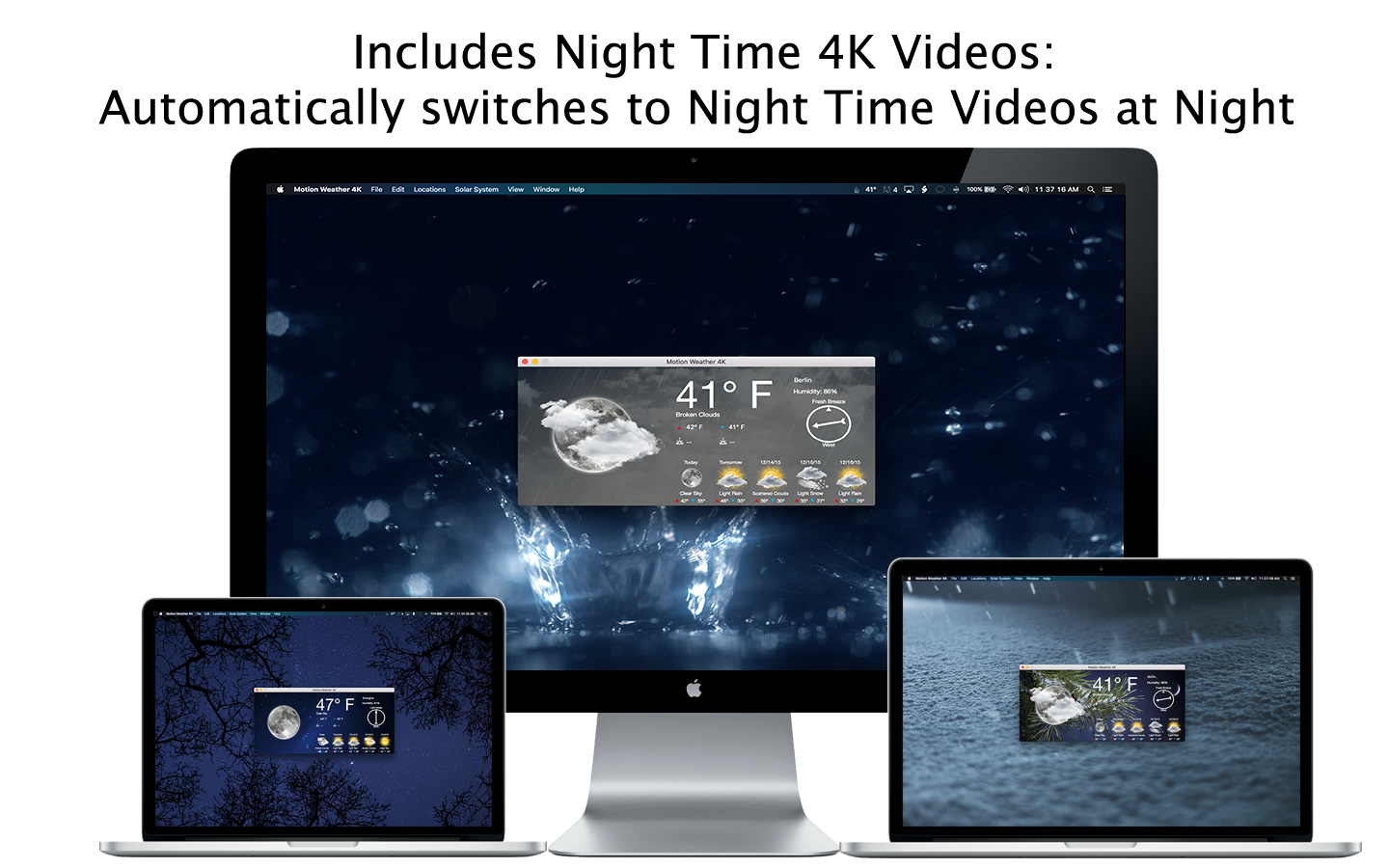 Introducing Motion Weather 4K: The most insanely beautiful and innovative weather application ever conceived. Motion Weather 4K turns your Wallpaper into breathtaking Cinema quality 4K video based on the Weather conditions outside - and is an excellent weather application in it's own right. Motion Weather 4K also "knows" when it's day time and night time and automatically switches to night time 4K videos when it's night outside! We've spent countless hours shooting and licensing some of the highest quality 4K videos in the world to deliver an experience like no other; and then spent even more time developing the app itself.